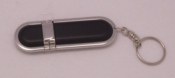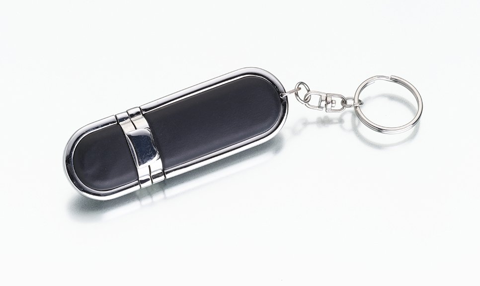 Descrição: Pen drive metálico com detalhe em couro sintético, com fechamento com tampa