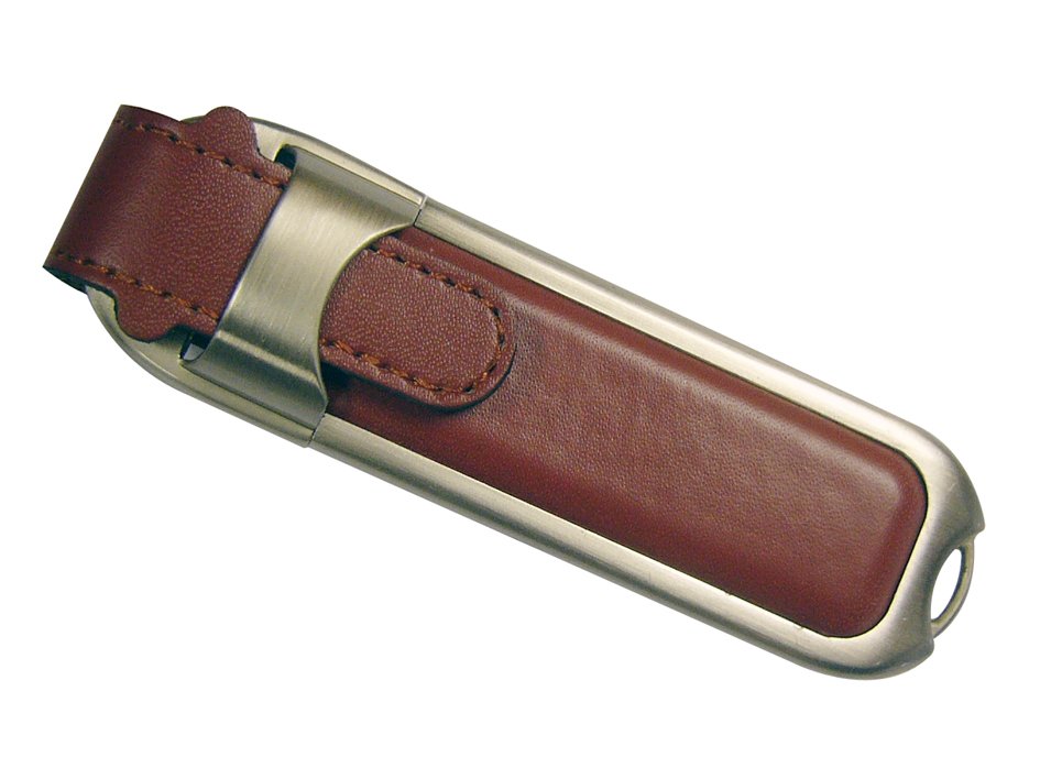 Descrição: Pen drive metálico com detalhe em couro sintético, com fechamento com tampa